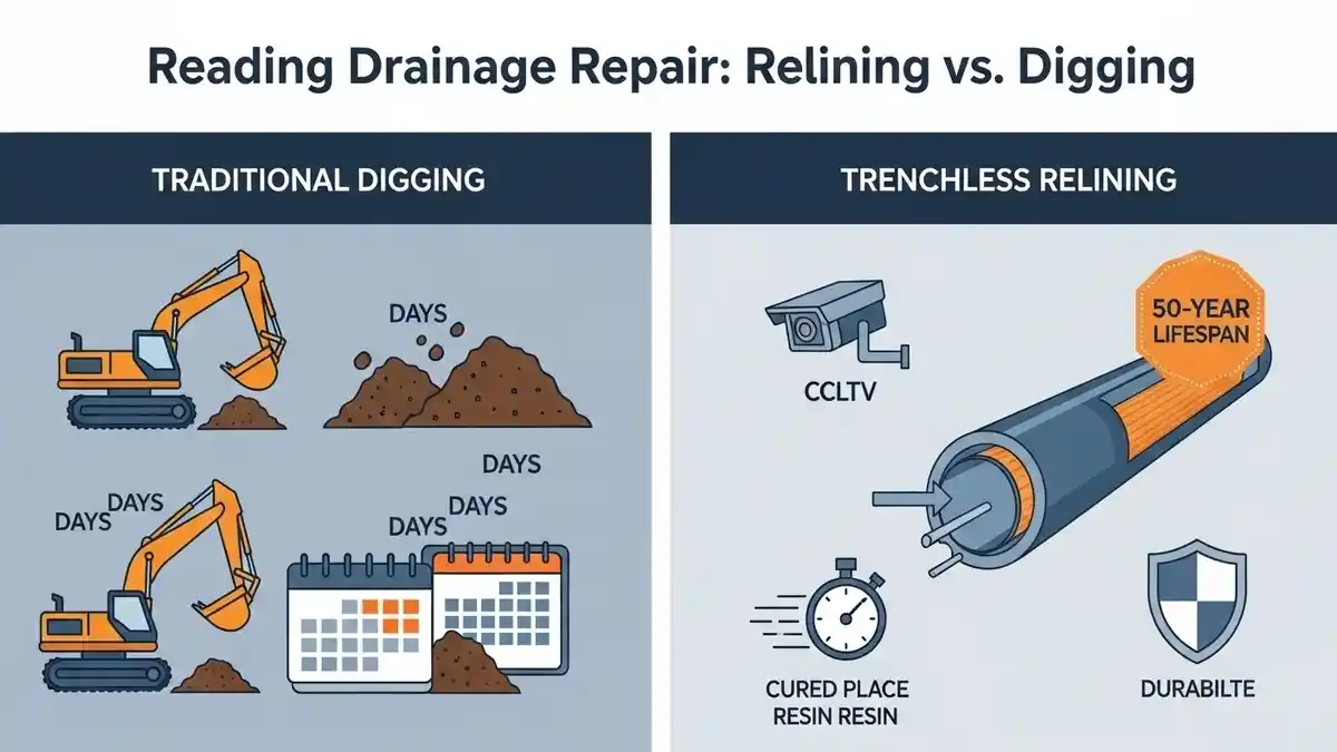 Avoid costly, messy excavations. Compare Yateley Drain Relining vs Digging to save your home, time, and money with our expert, minimally invasive, and durable no-dig repair solutions for local drains.