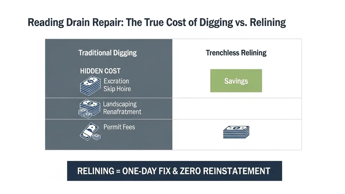 If you wait until the pipe collapses, the cost jumps from a standard £600–£1,200 relining job to a full-scale excavation that can easily exceed £3,000-£5,000, especially if we have to navigate utility lines or reinstate expensive landscaping near Yateley.